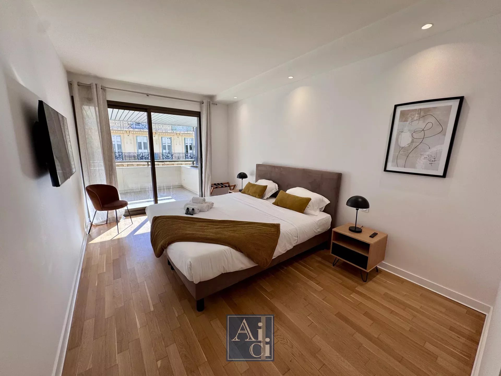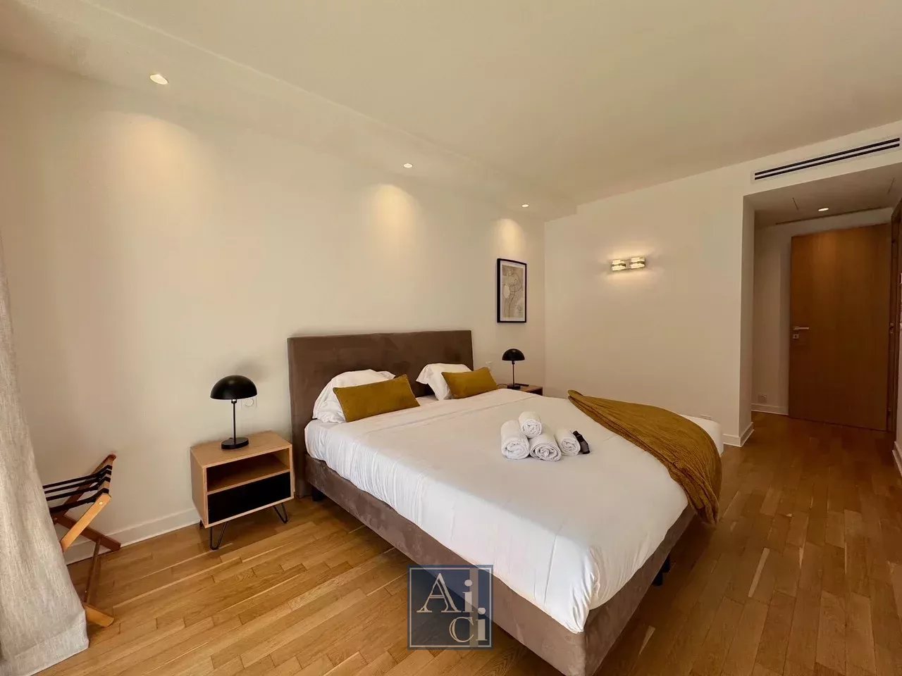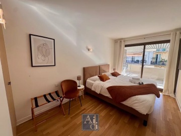 Cannes Gray d'Albion Residence. On a high floor, wonderful 3 bedrooms apartment. Entrance with guest toilets, living and dining room open on large terrace, full equipped open kitchen, 3 bedrooms with 3 bathrooms. A/C. Wifi.
