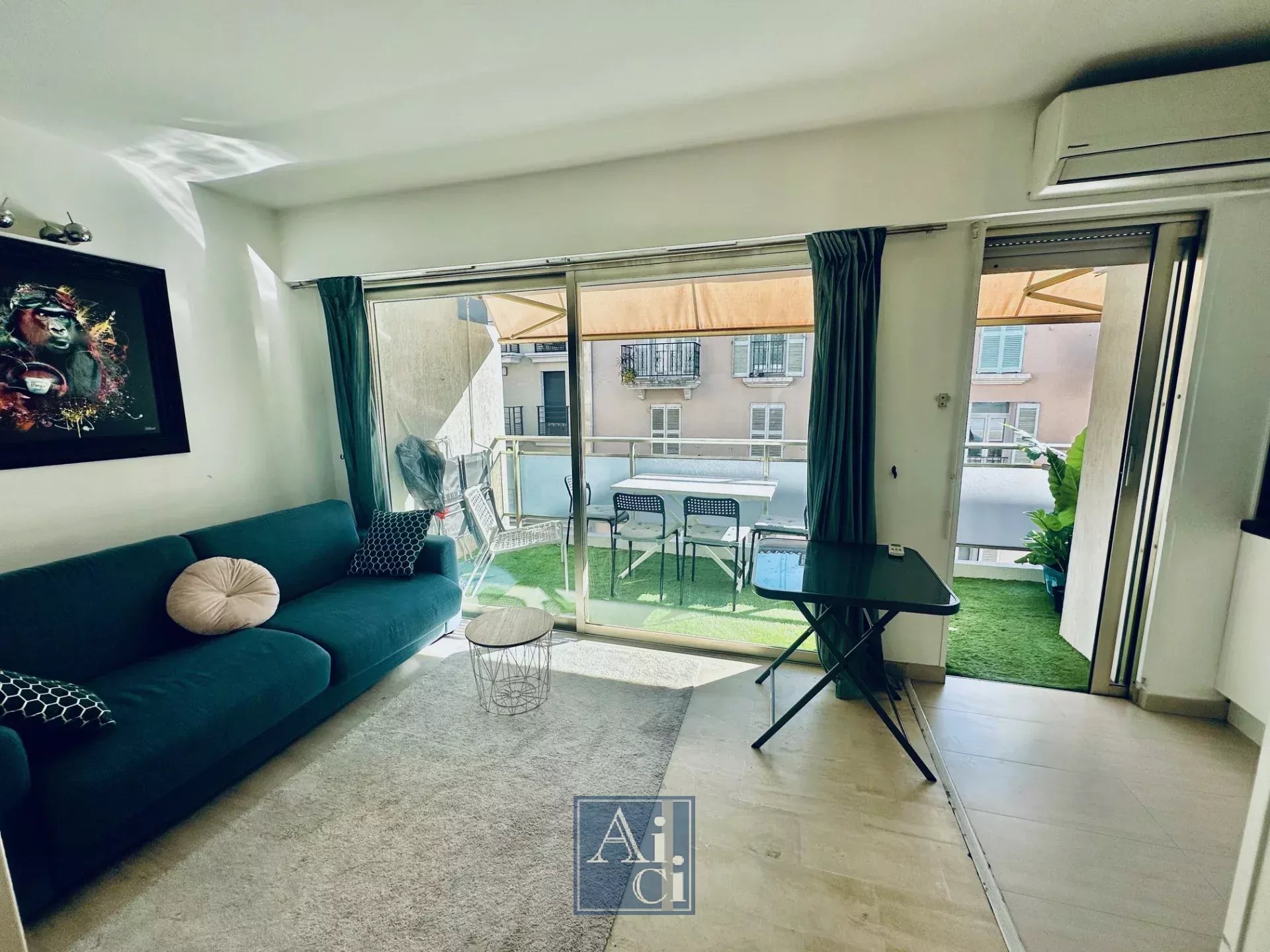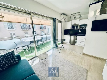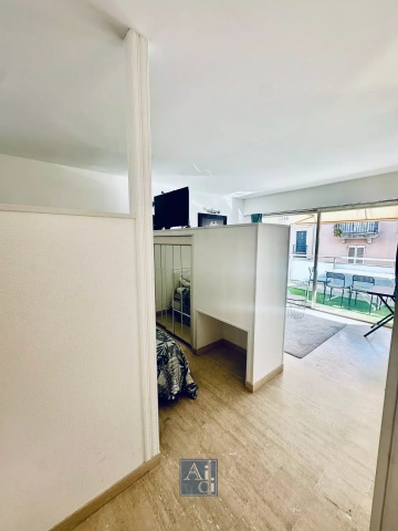 It comprises an entrance with built-in closet, a living room opening onto the terrace, a sleeping area, and a fully equipped open-plan kitchen also leading to the terrace. There is a shower room with toilet. Air conditioning included.